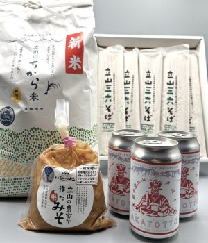 (左上から)立山のちから米、立山三六そば、立山の農家が作った米みそ、立山芦峅寺ビール「AKATOTTO」